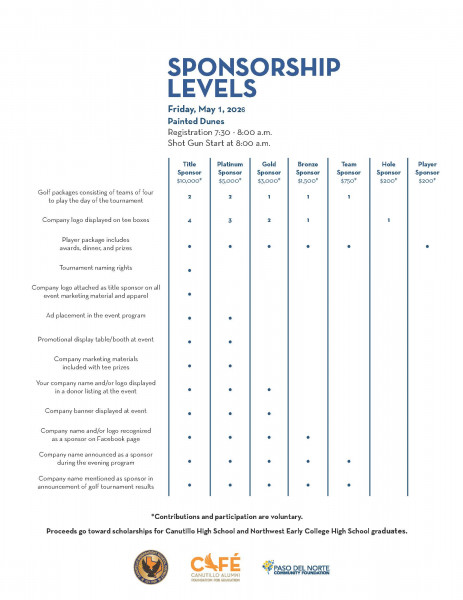 The Canutillo Alumni Foundation for Education (CAFÉ) invites you to participate in the annual CAFÉ Golf Tournament to support scholarships for Canutillo High School and Northwest Early College High School Graduates on Friday, May 1st